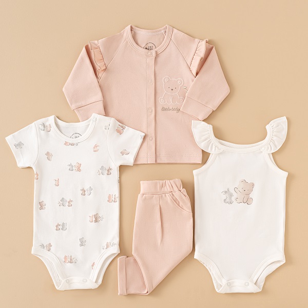 تکههای داخل ست شامل: سرهمی، بادی آستین کوتاه، بادی رکابی، مانتو، شلوار، کلاه، دستکش، جوراب، پیشبند، پتو دورپیچ کلاهدار، آروغگیر و سایر تکههای کاربردی.