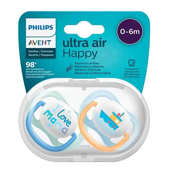 پستانک الترا ایر اونت جدیدترین فناوری پستانک را دارد که شرکت فیلیپس اونت ارائه کرده ، جوری طراحی شده که هوا به راحتی دور دسته جا به جا میشه و پستانک به صورت نوزاد نمی چسبه . جنس بدنه پستانک الترا ایر خیلی شبیه پوست بدن انسان است که اصلا حساسیت نمیده . سری پستانک الترا ایر بادامی یا دو سر ارتودنسی است که حالت فک نوزاد و کودک را به حالت طبیعی نگه می دارد و به هم نمیریزد . طرح های پستانک اونت خیلی جذاب است . طرح این پستانک خیلی خوبه و کشتی داره و I Love mama داره .