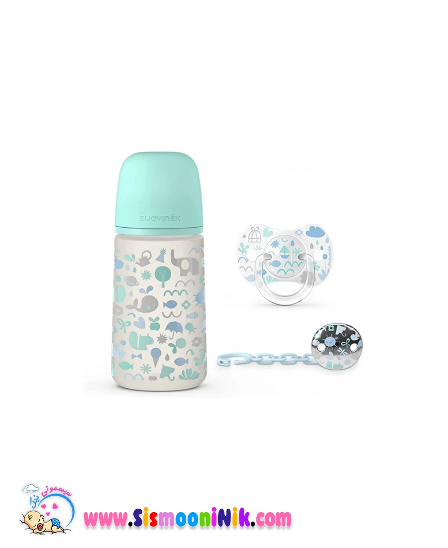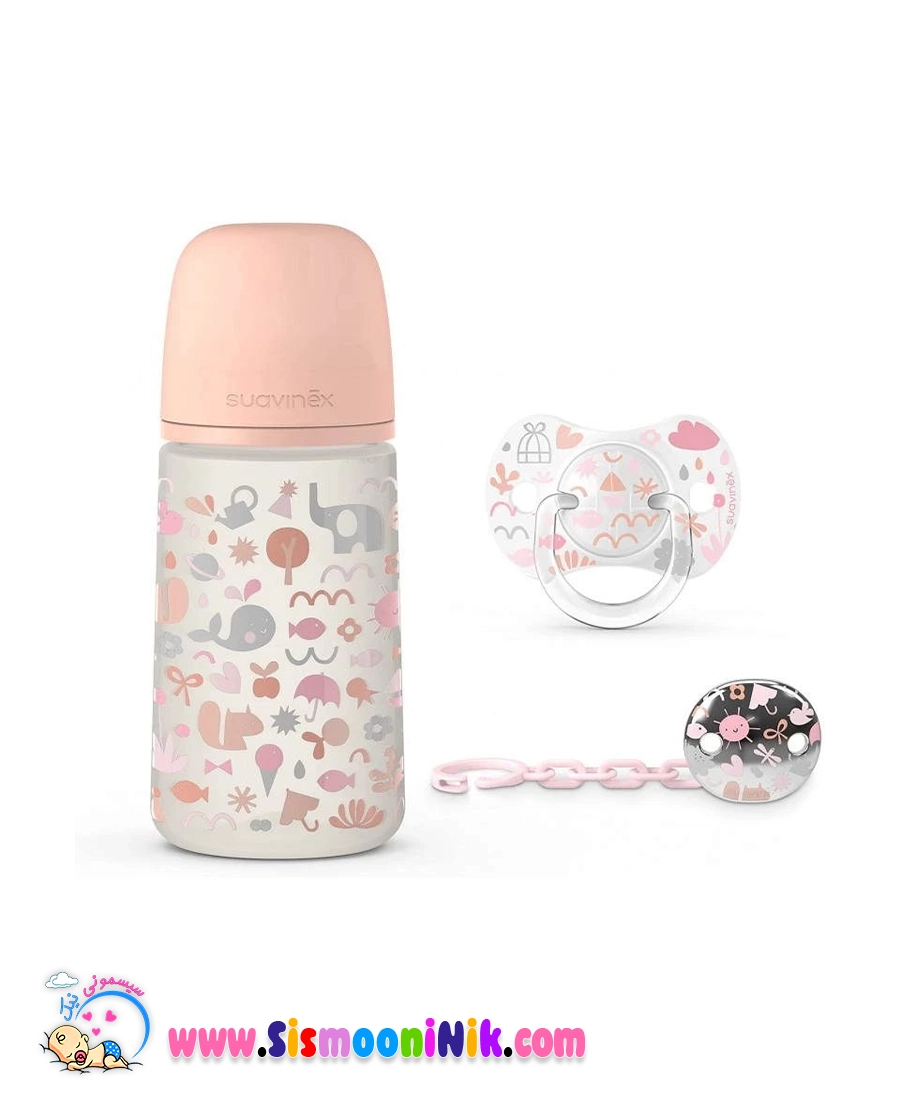 - پک 3 عددی : همراه با شیشه شیر، پستانک و بند پستانک